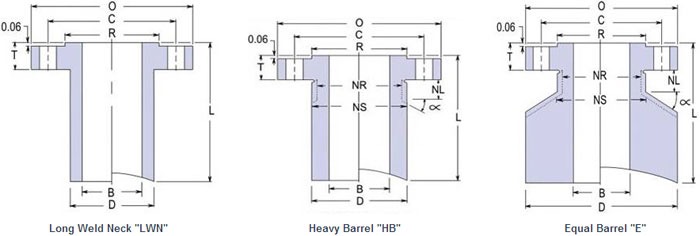 Long Neck Welding (abbreviated LWN) flanges are similar to a standard Welding Neck flange, but the “Neck” is considerably longer. This type is often used as a nozzle for a barrel or column. In addition, there are the type LWN Heavy Barrel (HB) and the Equal LWN Barrel (E); they have a different shape and a thicker “Wall”.